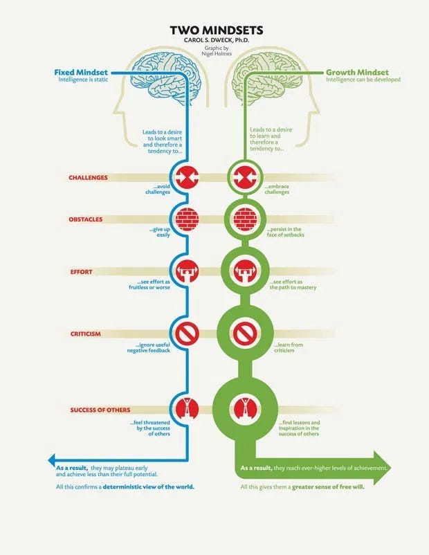 You may be familiar with the term growth mindset. The theory and science behind Carolyn Dweck's work in her book 'Mindset' has made strides in the last decade because of the profound shifts that can happen when applying the knowledge. We do not have 'fixed' abilities,' and all it takes is the willingness and determination to shift and grow--the heart of a growth mindset. People with a fixed mindset obstruct their development through their need for approval, avoidance, and fear of failure. A handy info graph below to see how the different mindsets work.